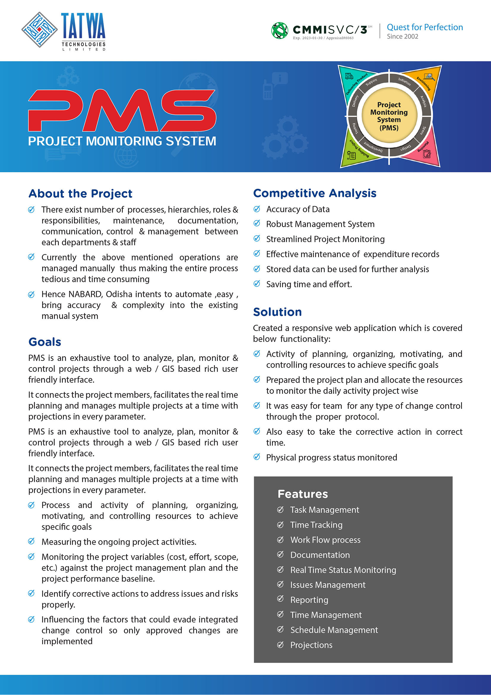 Learn More View BrochurePMS is an exhaustive tool to analyze, plan, monitor & control projects through a web / GIS based...